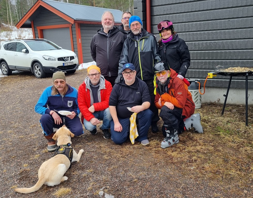 Några av deltagarna samlade efter onsdagens lunch utanför en av stugorna.